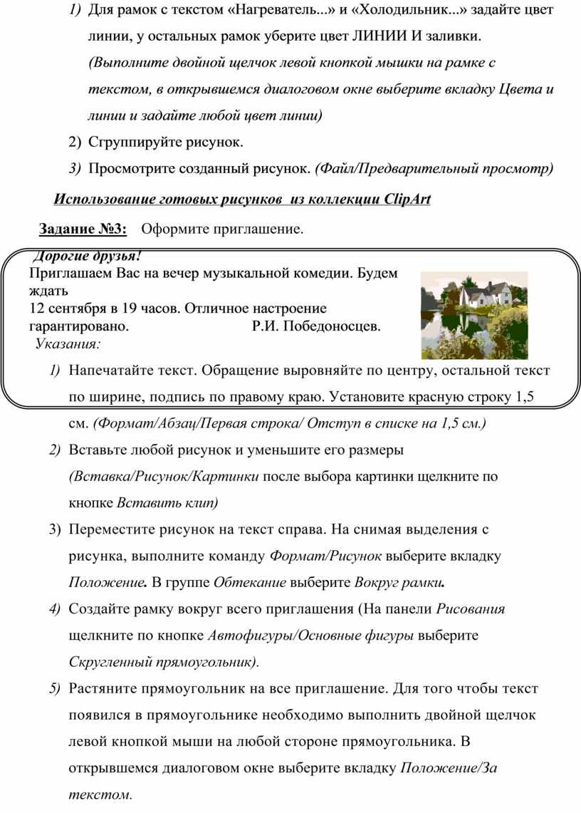 1) Напечатайте текст. Обращение выровняйте по центру, остальной текст по ширине, подпись по правому краю. Установите красную строку 1,5 см. (Формат/Абзац/Первая строка/ Отступ в списке на 1,5 см.)