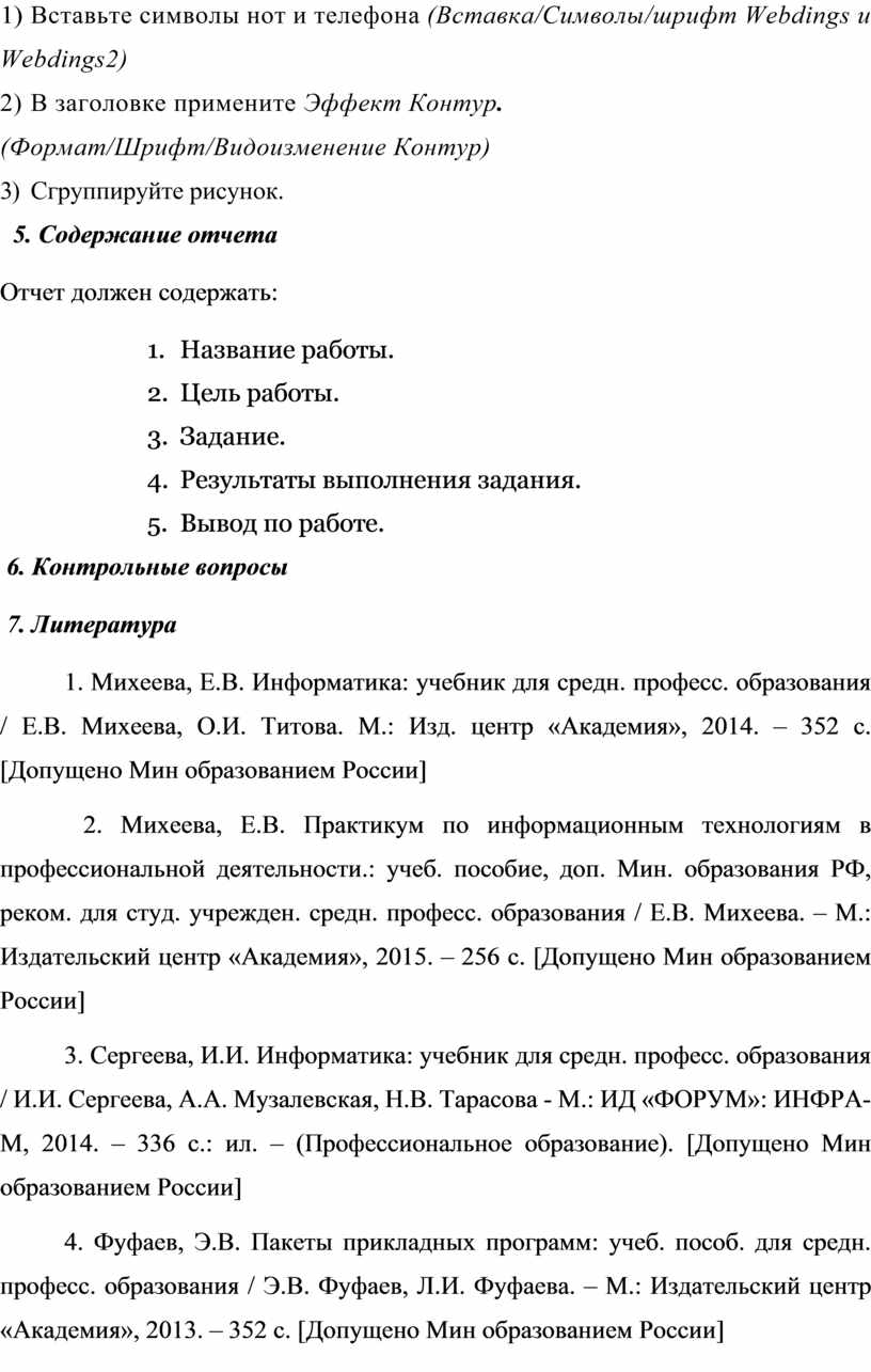 2. Михеева, Е.В. Практикум по информационным технологиям в профессиональной деятельности.: учеб. пособие, доп. Мин. образования РФ, реком. для студ. учрежден. средн. професс. образования / Е.В. Михеева. – М.: Издательский центр «Академия», 2015. – 256 с. [Допущено Мин образованием России]