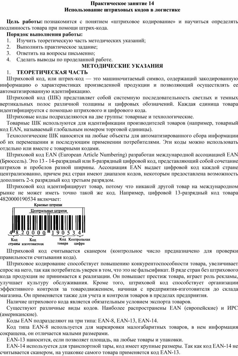 Штриховой код EAN (European Article Numbering) разработан международной ассоциацией EAN (Брюссель). Это 13 - 14-разрядный или 8-разрядный цифровой код, представляющий собой сочетание штрихов и пробелов разной ширины. Ассоциация EAN выдает цифровой код каждой стране централизованно, причем ряд стран имеют диапазон кодов, некоторым предоставлена возможность дополнить 2-х разрядный код третьим разрядом.