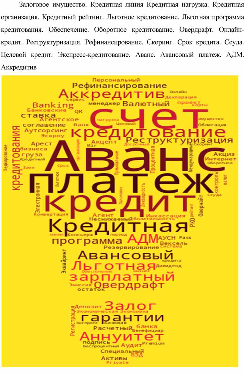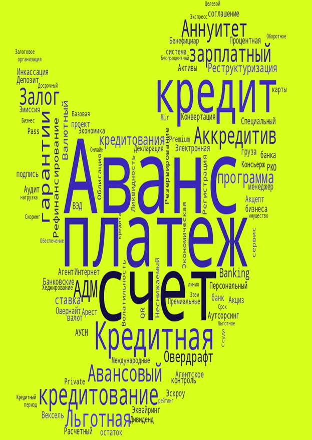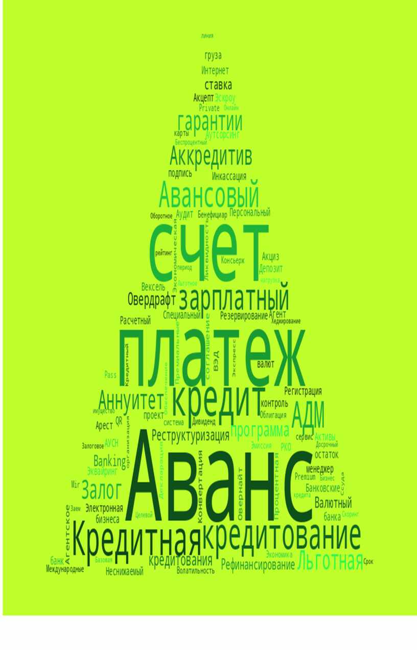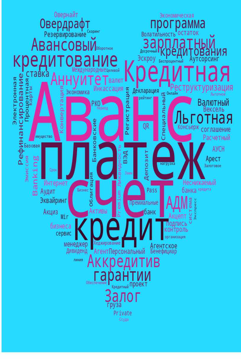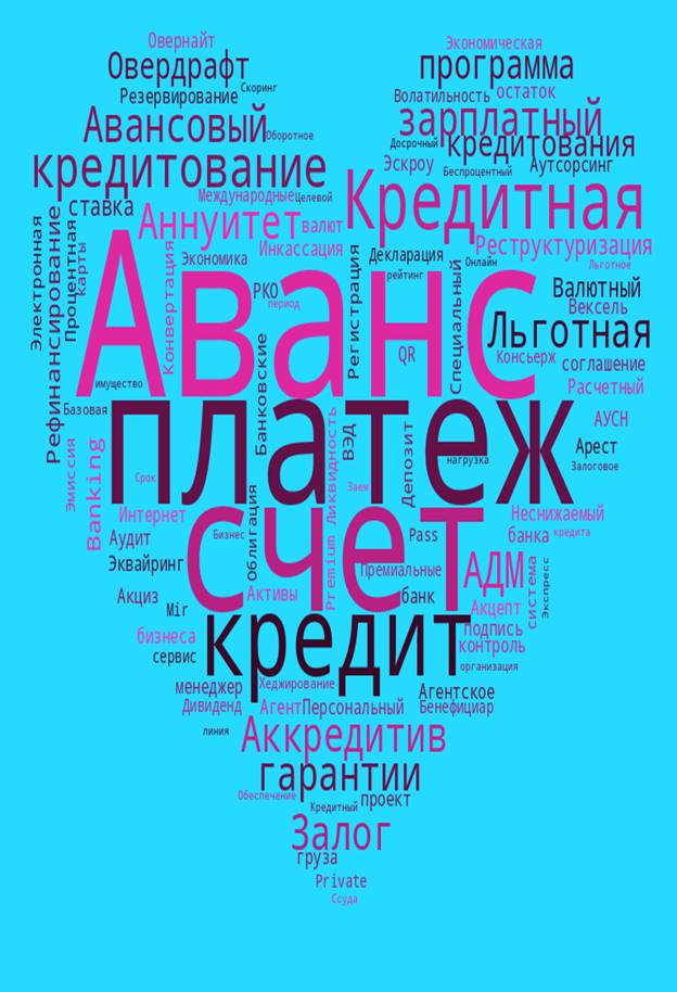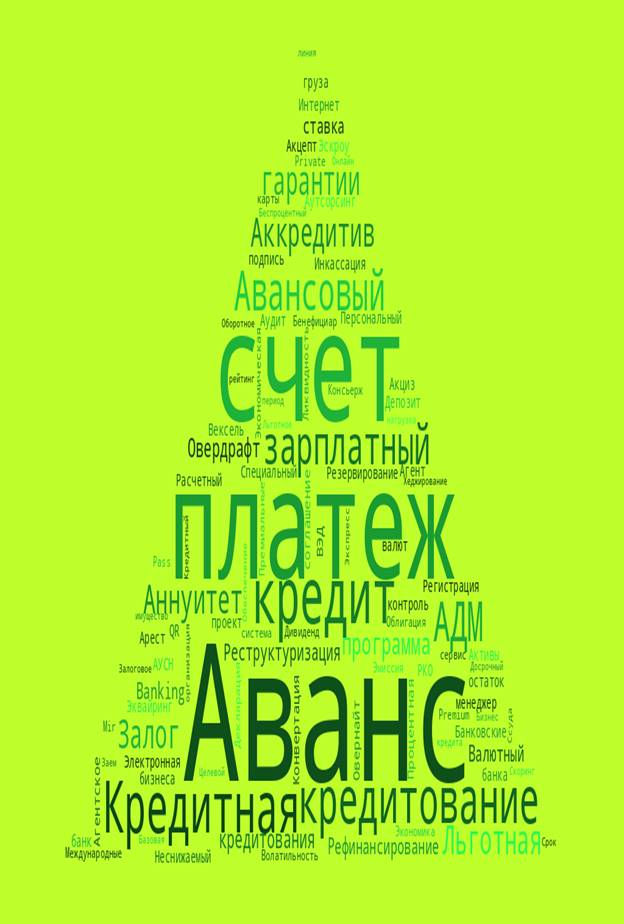 Аванс. Аванс зарплатный. Авансовый платеж. Агент банка. Агентское соглашение. АДМ. Аккредитив. Активы. Акцепт. Акциз Аннуитет. Арест груза. Аудит. АУСН. Аутсорсинг. Расчетный счет. РКО. Резервирование. Специальный счет. Эскроу. Банковские гарантии Инкассация. Эквайринг. QR. Зарплатный проект. Персональный менеджер. Электронная подпись. Регистрация бизнеса. Интернет-банк. Залог. Льготная программа кредитования. Овердрафт. Реструктуризация. Рефинансирование. Вексель. Депозит. Неснижаемый остаток. Овернайт. Процентная ставка. Валютный контроль. Валютный счет. ВЭД. Конвертация валют. Международные гарантии. Бенефициар. Декларация. Экономика. Экономическая система. Эмиссия. Mir Pass. Premium Banking. Private Banking. Консьерж-сервис. Премиальные карты. Волатильность. Дивиденд. Ликвидность. Облигация. Хеджирование. Аннуитет. Базовая ставка. Беспроцентный период . Бизнес-кредит. Досрочный платеж. Заем. Залог. Залоговое имущество. Кредитная линия Кредитная нагрузка. Кредитная организация. Кредитный рейтинг. Льготное кредитование. Льготная программа кредитования. Обеспечение. Оборотное кредитование. Овердрафт. Онлайн-кредит. Реструктуризация. Рефинансирование. Скоринг. Срок кредита. Ссуда. Целевой кредит. Экспресс-кредитование. Аванс. Авансовый платеж. АДМ. Аккредитив