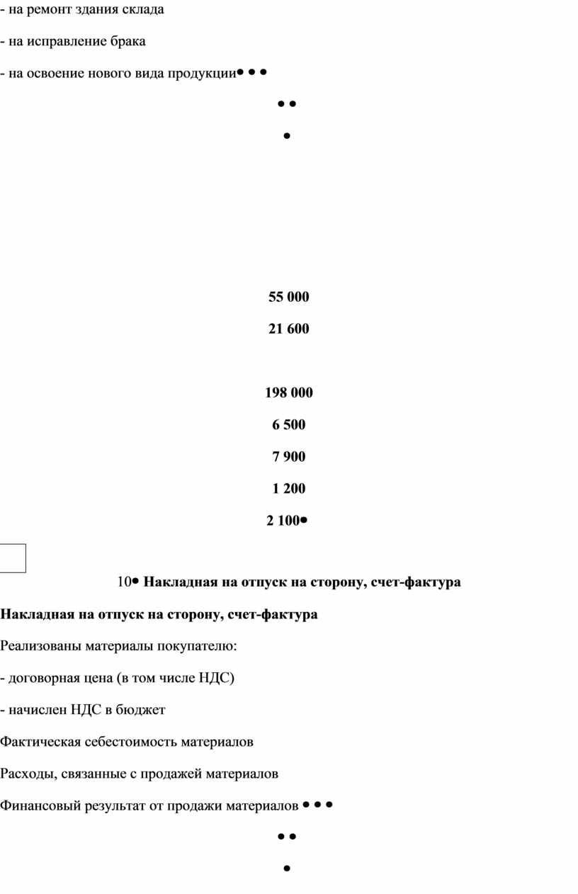 Требования-накладные Списываются израсходованные материалы по учетной цене: - на производство продукции в цех основного производства - на производство в инструментальный цех - на строительство здания офиса, выполняемое хозяйственным способом - на ремонт оборудования цехов - на ремонт здания склада - на исправление брака - на освоение нового вида продукции |