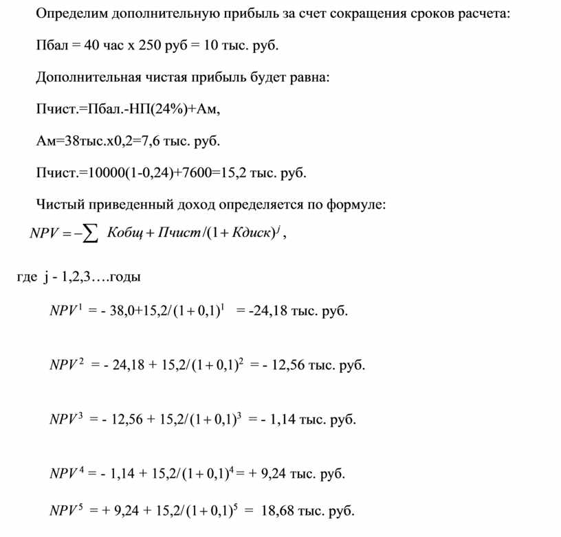 Определим дополнительную прибыль за счет сокращения сроков расчета: Пбал = 40 час х 250 руб = 10 тыс. руб.