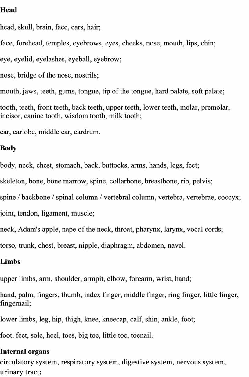 forearm - рука elbow - локоть wrist - запястье thumb - большой палец hip = thigh - бедро knee - колено calf - икра (ноги) ankle - лодыжка skin - кожа spleen - селезёнка intestine - кишечник kidney - почка gall-bladder - желчный пузырь bladder - мочевой пузырь framework - диафрагма |