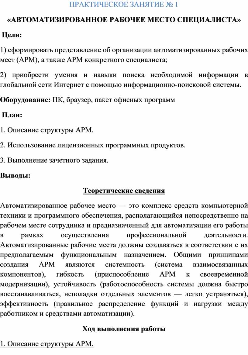 1) сформировать представление об организации автоматизированных рабочих мест (АРМ), а также АРМ конкретного специалиста;
