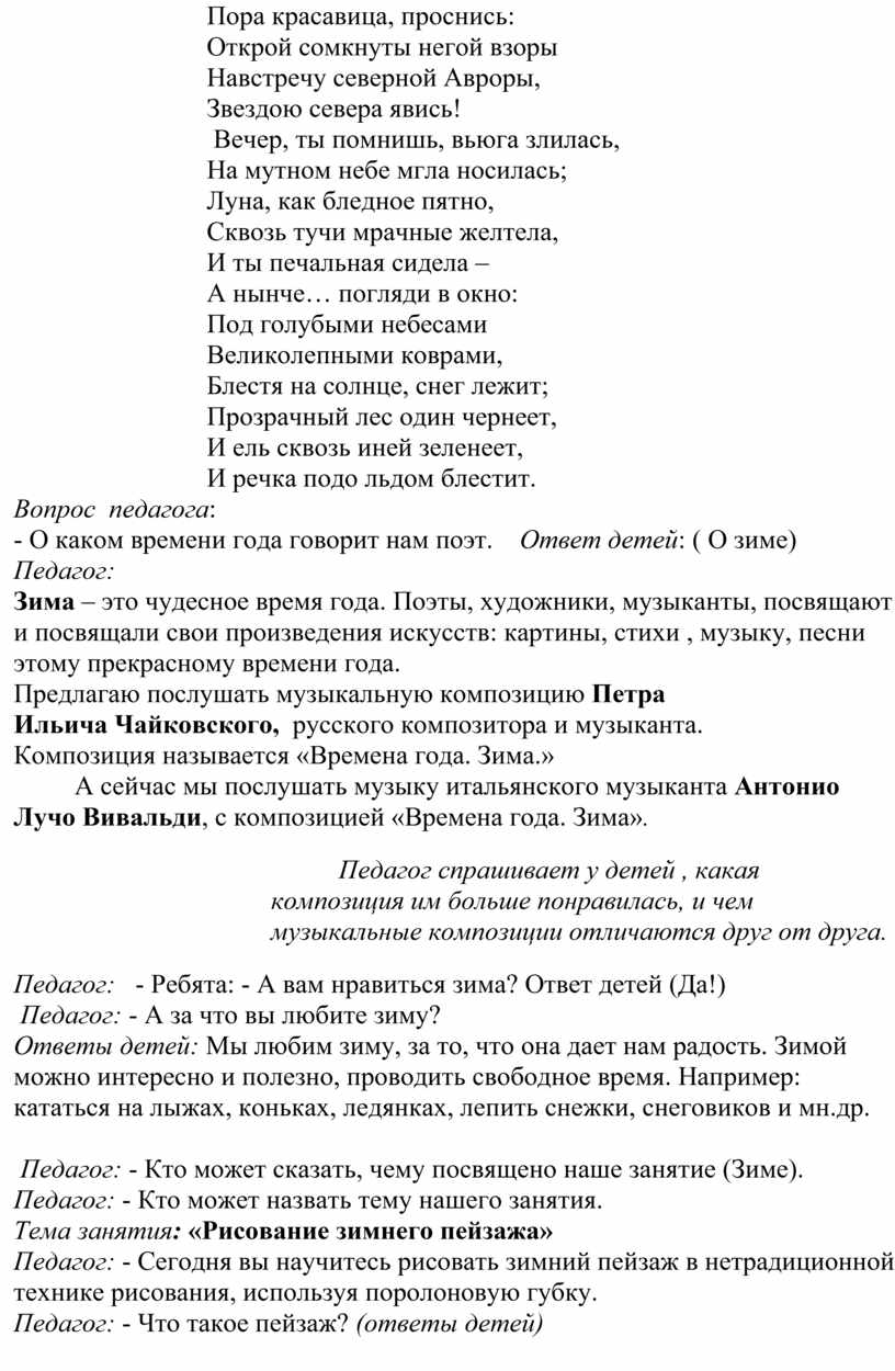 Педагог: Здравствуйте! Наше занятие я хотела начать с отрывка стихотворения русского поэта А.С. Пушкина.
