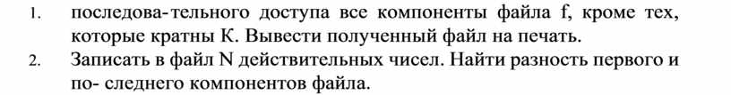 6. Записать файл N натуральных чисел. Получить в другом файле последова- тельного доступа все компоненты файла f, кроме тех, которые кратны К. Вывести полученный файл на печать.