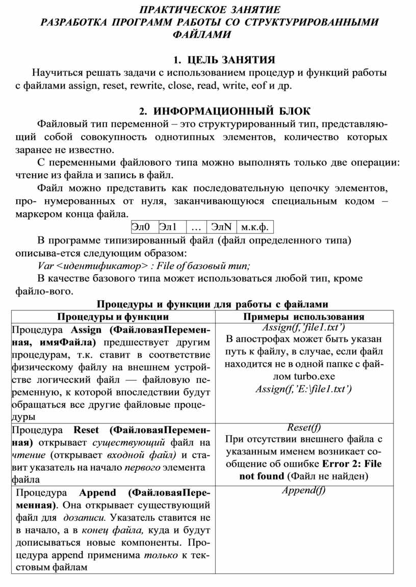 Научиться решать задачи с использованием процедур и функций работы с файлами assign, reset, rewrite, close, read, write, eof и др.