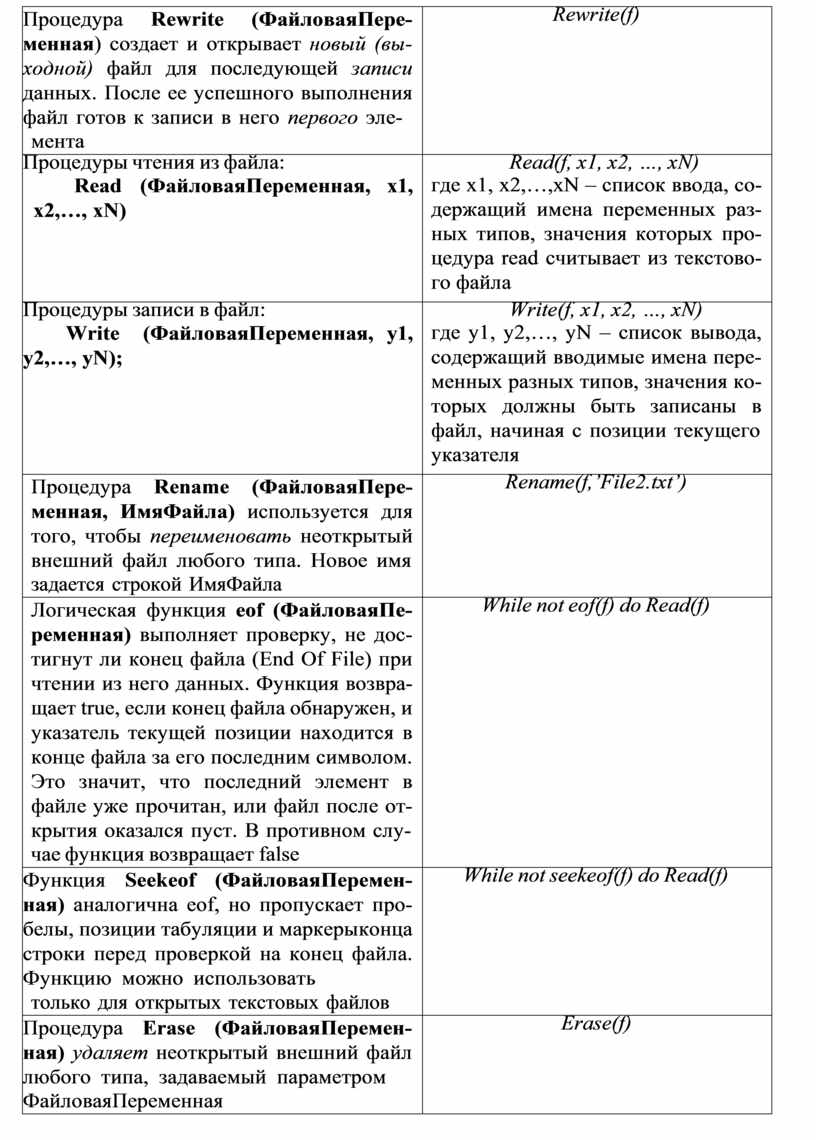 Write(f, x1, x2, …, xN) где y1, y2,…, yN – список вывода, содержащий вводимые имена пере- менных разных типов, значения ко- торых должны быть записаны в файл, начиная с позиции текущего указателя |