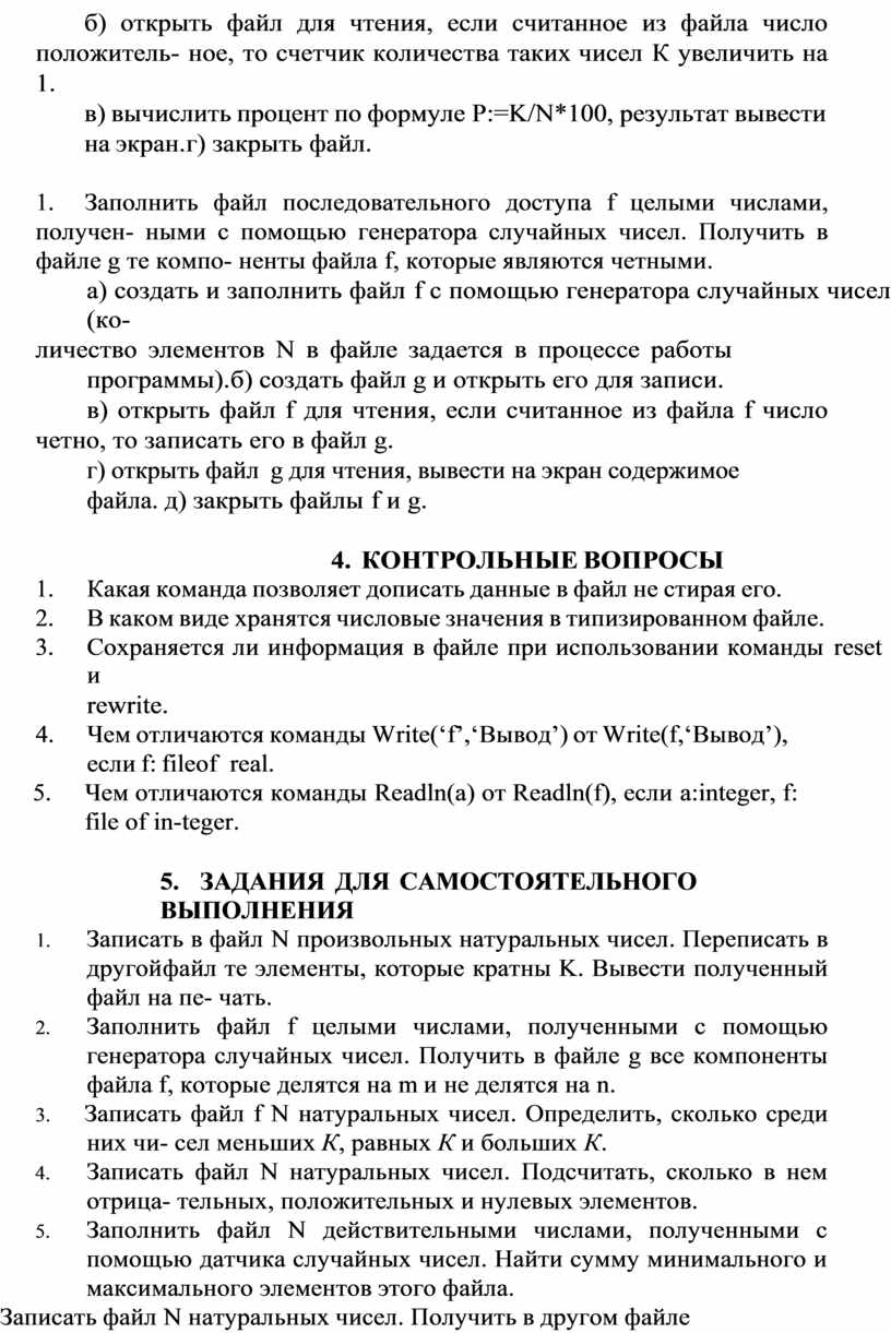 1. Заполнить файл последовательного доступа f целыми числами, получен- ными с помощью генератора случайных чисел. Определить сколько процентов от общего числа элементов составляют положительные элементы файла.