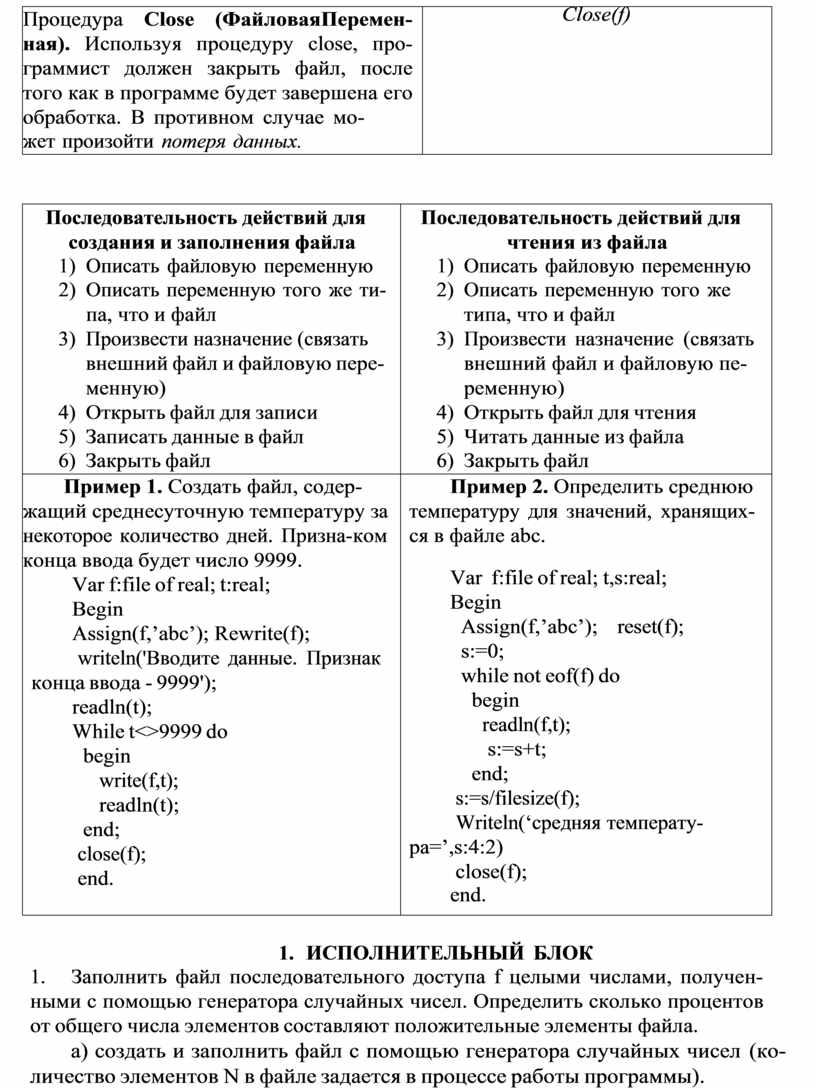 Процедура Close (ФайловаяПеремен- ная). Используя процедуру close, про- граммист должен закрыть файл, после того как в программе будет завершена его обработка. В противном случае мо- жет произойти потеря данных. |