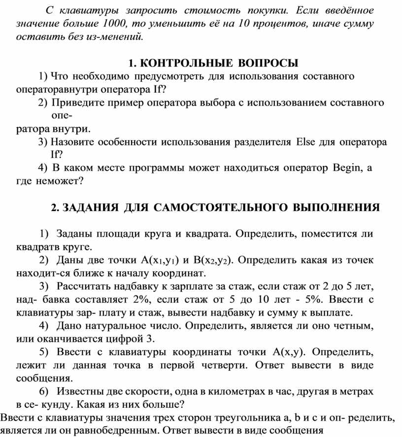 1) Что необходимо предусмотреть для использования составного оператора внутри оператора If?