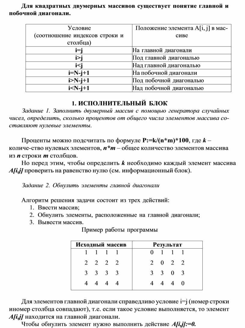 Для квадратных двумерных массивов существует понятие главной и побочной диагонали.