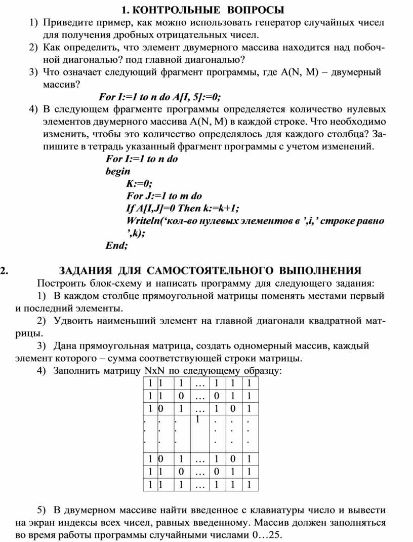 For I:=1 to n do Begin For J:=1 to m do Begin A[I, J]:=Random(50); write(A[I, J],’ ‘); End; Writeln; End; |