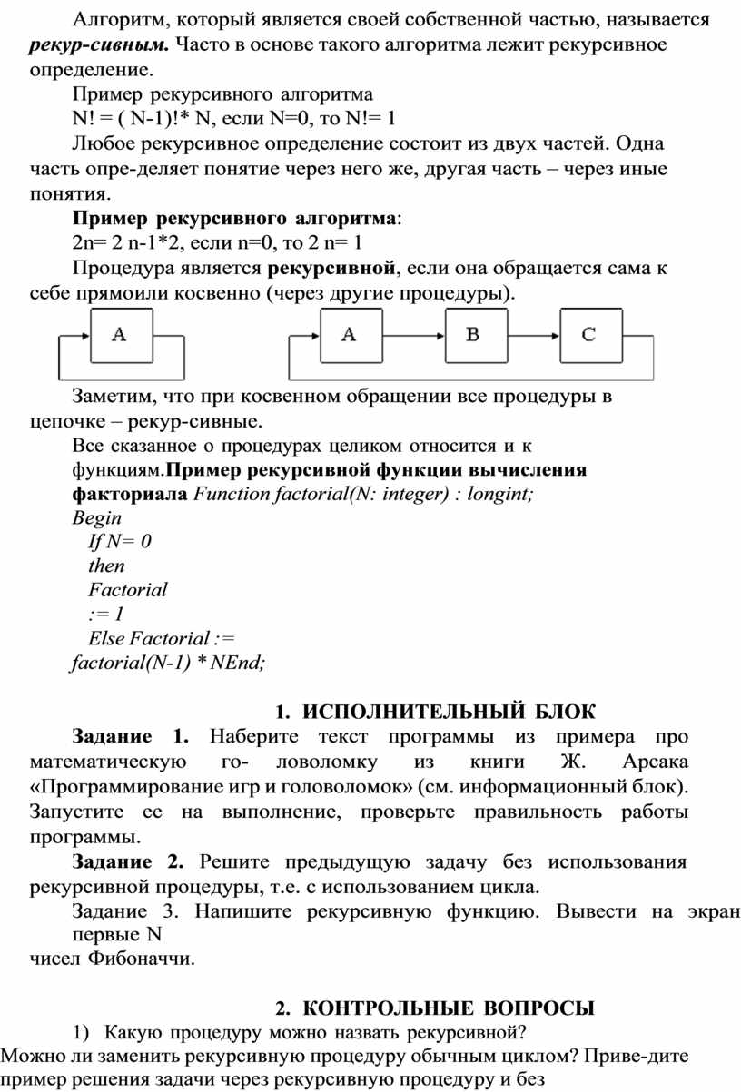 В языке Паскаль процедуры и функции могут быть рекурсивными. Под- программа называется рекурсивной, если она вызывает саму себя. Рекурсивным может быть описание подпрограммы или обращение к ней.