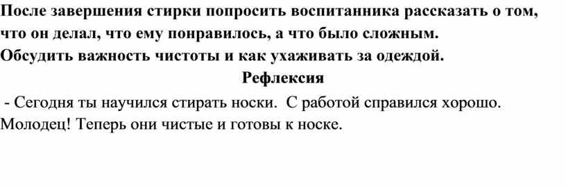 После завершения стирки попросить воспитанника рассказать о том, что он делал, что ему понравилось, а что было сложным.