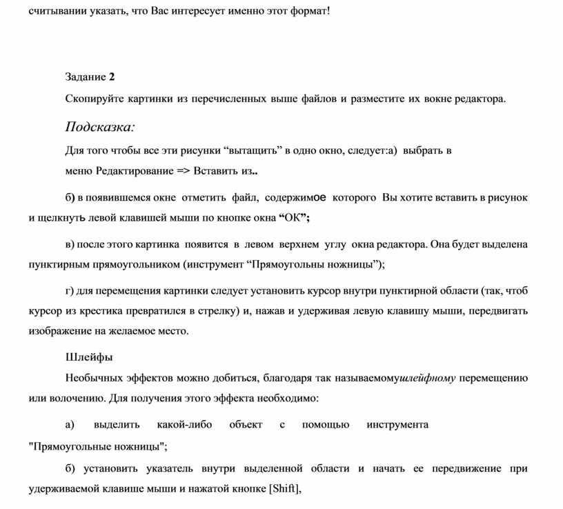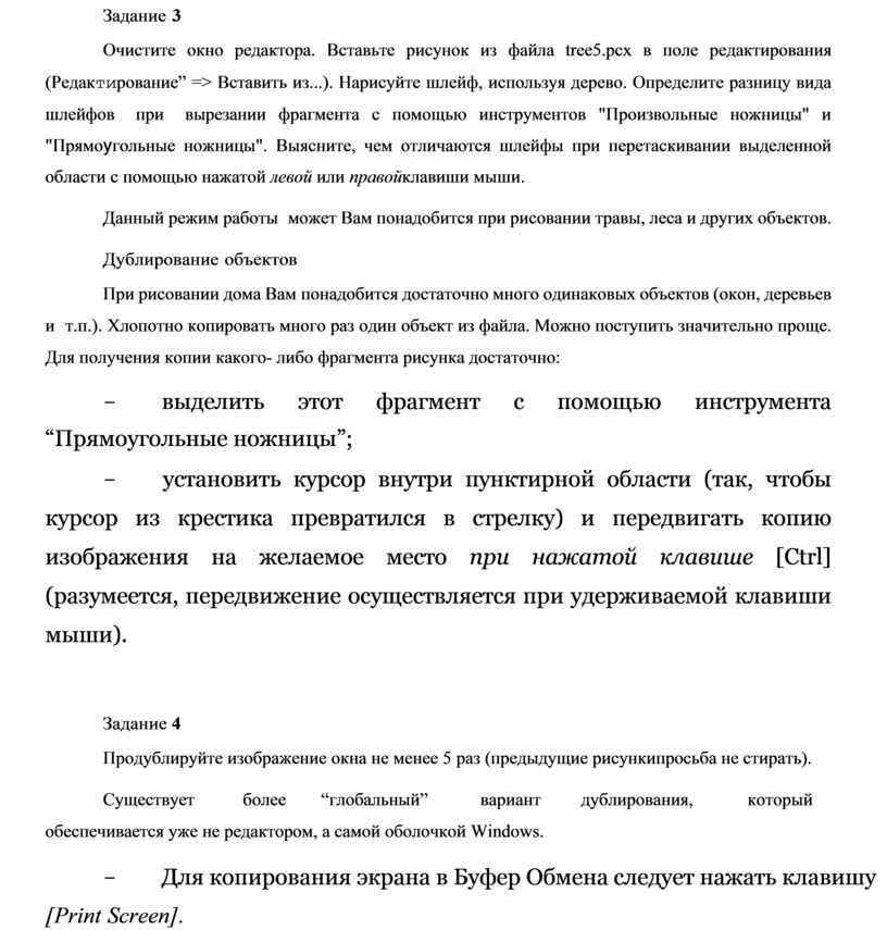 Очистите окно редактора. Вставьте рисунок из файла tree5.pcx в поле редактирования (Редактирование” => Вставить из...). Нарисуйте шлейф, используя дерево. Определите разницу вида шлейфов при вырезании фрагмента с помощью инструментов "Произвольные ножницы" и "Прямоугольные ножницы". Выясните, чем отличаются шлейфы при перетаскивании выделенной области с помощью нажатой левой или правой клавиши мыши.
