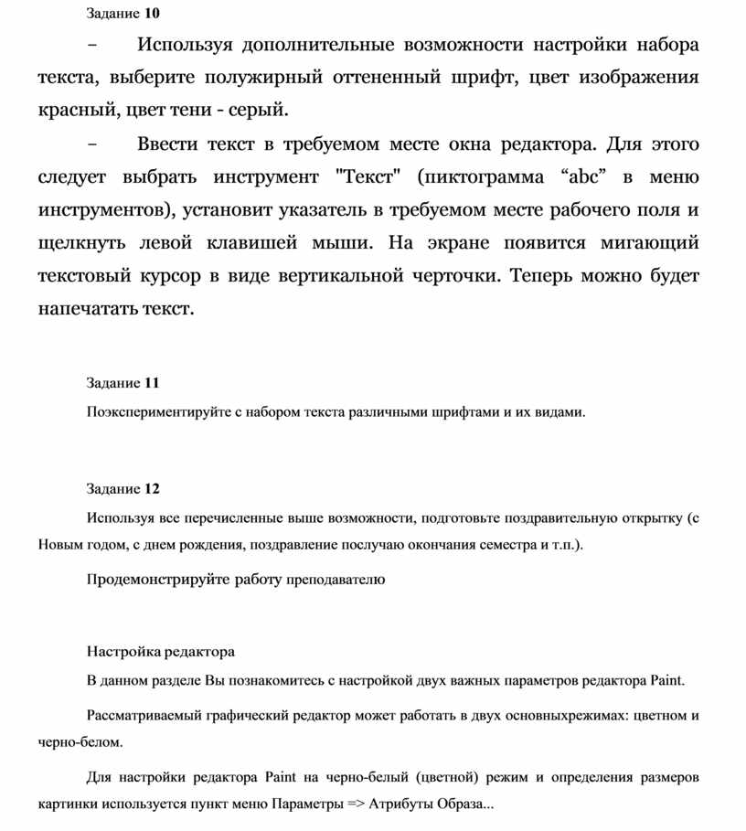 Для настройки редактора Paint на черно-белый (цветной) режим и определения размеров картинки используется пункт меню Параметры => Атрибуты Образа...