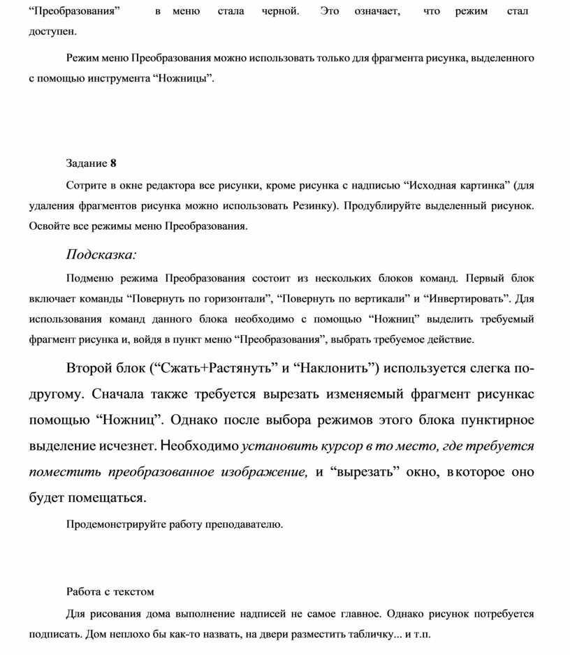 Режим меню Преобразования можно использовать только для фрагмента рисунка, выделенного с помощью инструмента “Ножницы”.