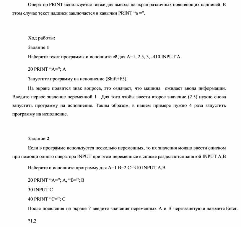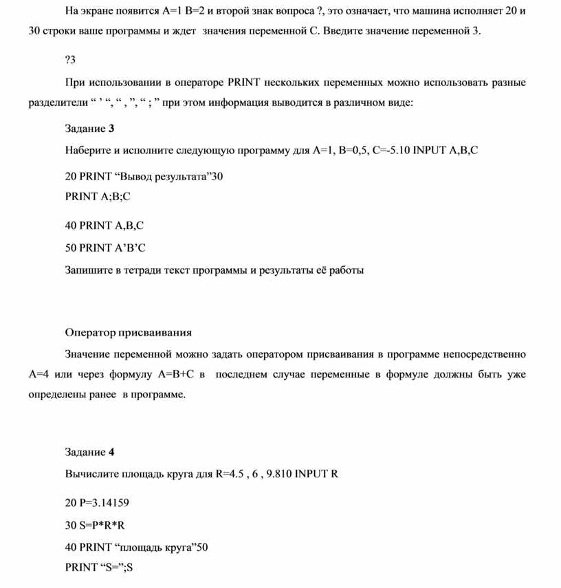 При написании программы, как правило, используют переменные, называют их буквами латинского алфавита A, B, C, D. При исполнении программы необходимо определить значение используемых в программе переменных. Это позволяет сделать оператор INPUT. При этом каждой переменной присваивается одно значение. Значение переменной хранится в ячейке памяти и для того чтобы вывести его на экран необходимо использовать в программе оператор PRINT.