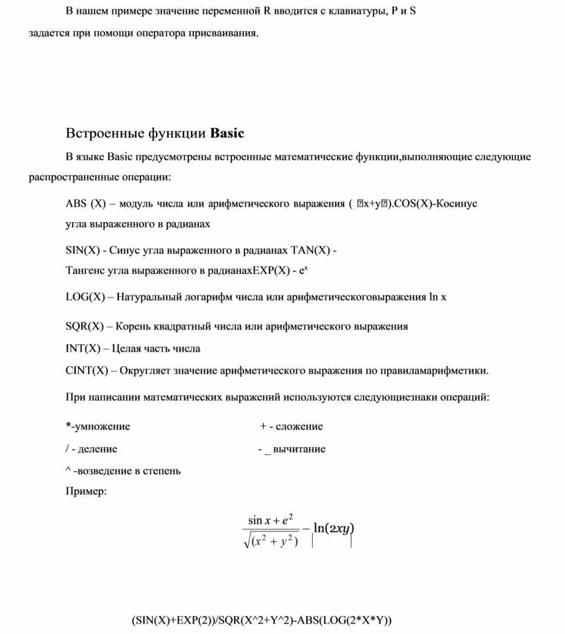 В языке Basic предусмотрены встроенные математические функции, выполняющие следующие распространенные операции: