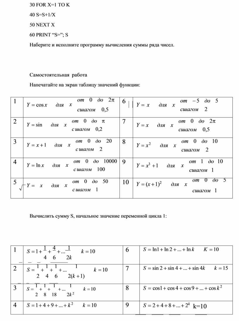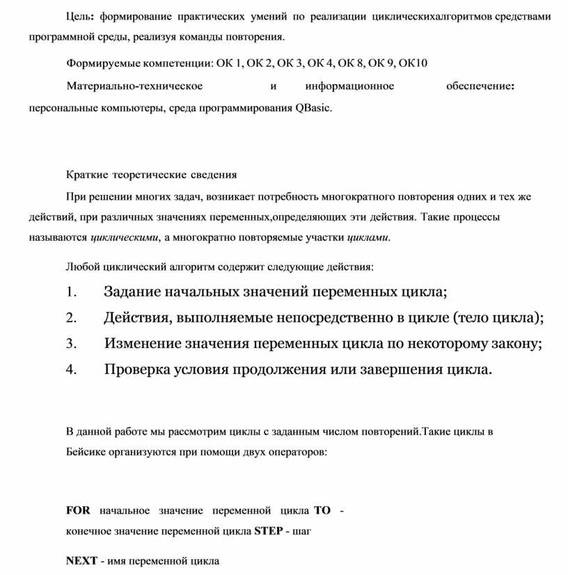 В данной работе мы рассмотрим циклы с заданным числом повторений. Такие циклы в Бейсике организуются при помощи двух операторов: