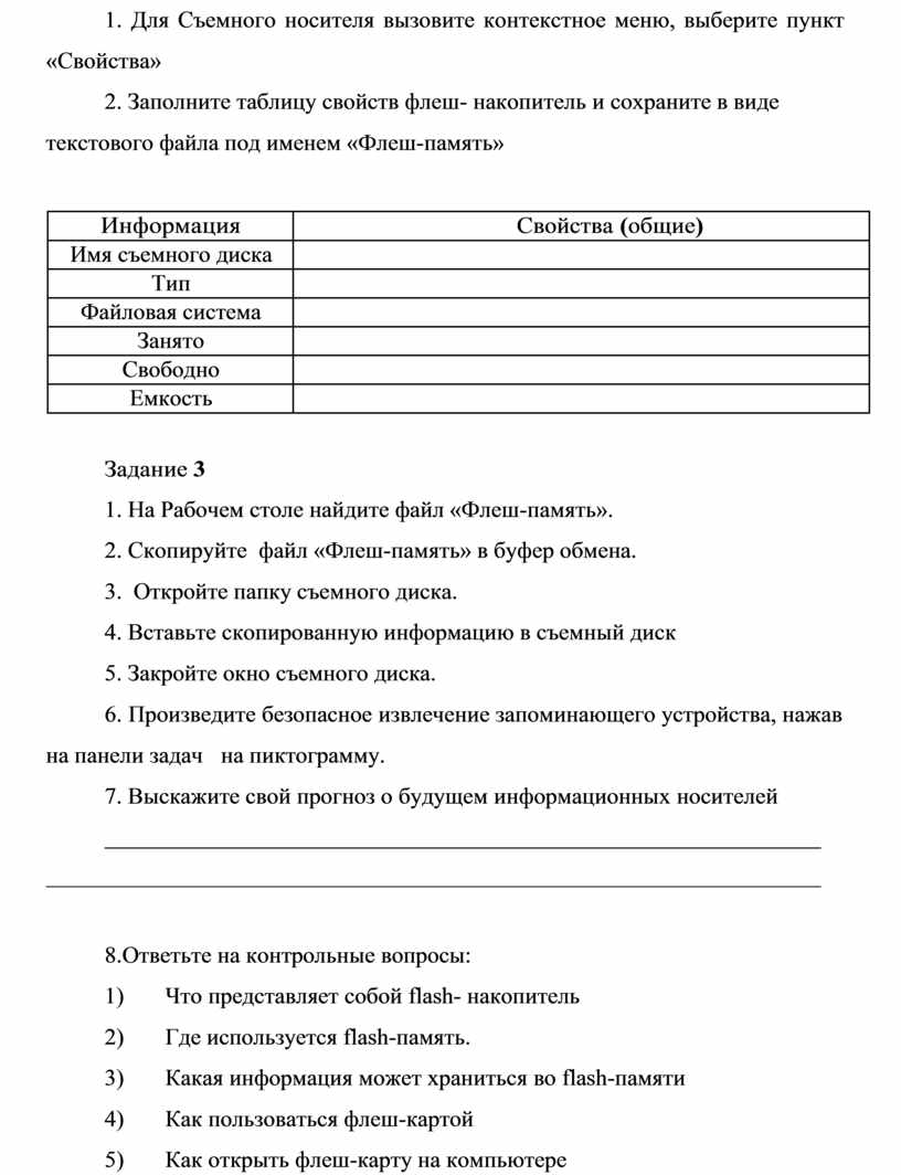 4. Заполните таблицу свойств флеш- накопитель и сохраните в виде текстового файла под именем «Флеш-память»