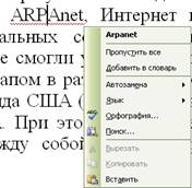 3. Обратите внимание, что некоторые слова в тексте подчеркнуты красной волнистой линией или зеленой волнистой линией. Значит Ваш Word настроен на автоматическую проверку орфографии и грамматики. Красная линия - орфографическая ошибка. Щелкаем правой кнопкой по подчеркнутому слову. Встроенный словарь предлагает слова для замены, вы вбираете слово из списка, если же слово набрано верно, и в этом уверены, можете его Добавить в словарь. Если сомневаетесь нажмите Пропустить все.