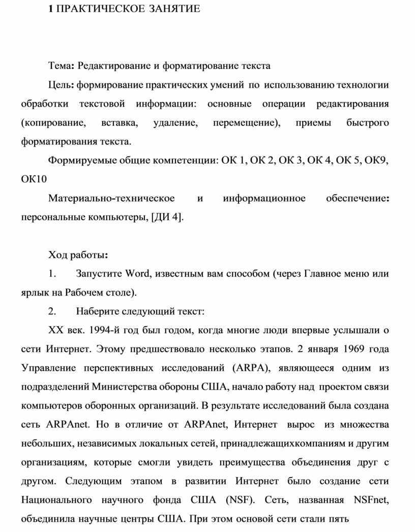 Цель: формирование практических умений по использованию технологии обработки текстовой информации: основные операции редактирования (копирование, вставка, удаление, перемещение), приемы быстрого форматирования текста.
