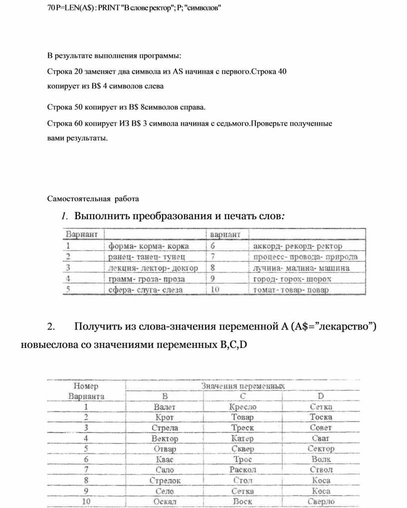 2. Получить из слова-значения переменной А (A$=”лекарство”) новые слова со значениями переменных B,C,D