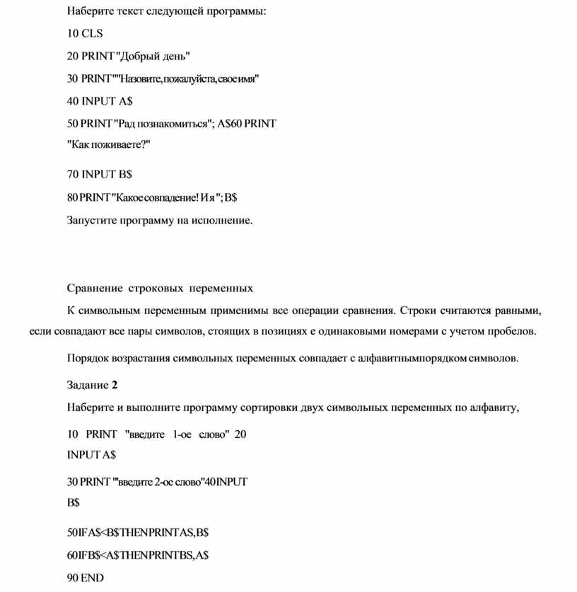 10 PRINT "введите 1-ое слово" 20 INPUT A$