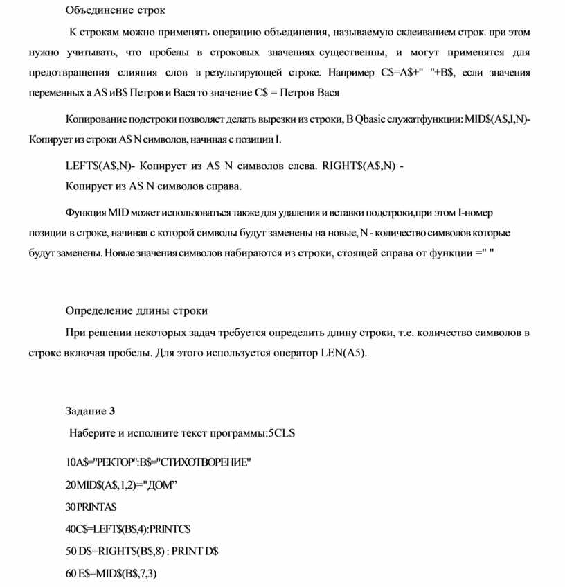 К строкам можно применять операцию объединения, называемую склеиванием строк. при этом нужно учитывать, что пробелы в строковых значениях существенны, и могут применятся для предотвращения слияния слов в результирующей строке. Например С$=А$+" "+В$, если значения переменных a AS и В$ Петров и Вася то значение С$ = Петров Вася