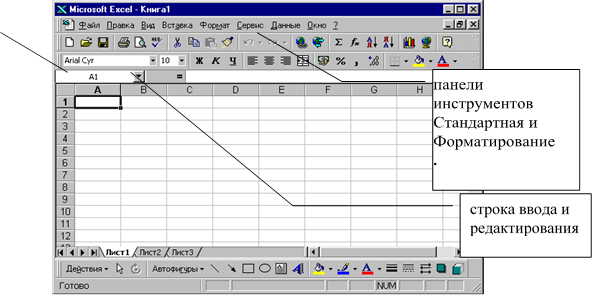 После запуска программы на экране открывается новый документ – чистый лист (Лист 1) рабочей книги (Книга 1). Для облегчения работы пользователя все документы в Excel организованы в форме рабочих книг, каждая из которой состоит из 16 рабочих листов.