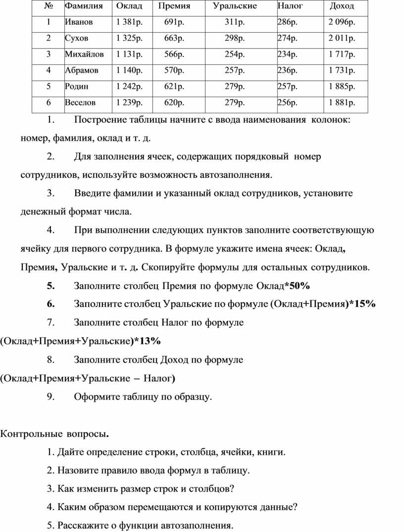 1. Построение таблицы начните с ввода наименования колонок: номер, фамилия, оклад и т. д.