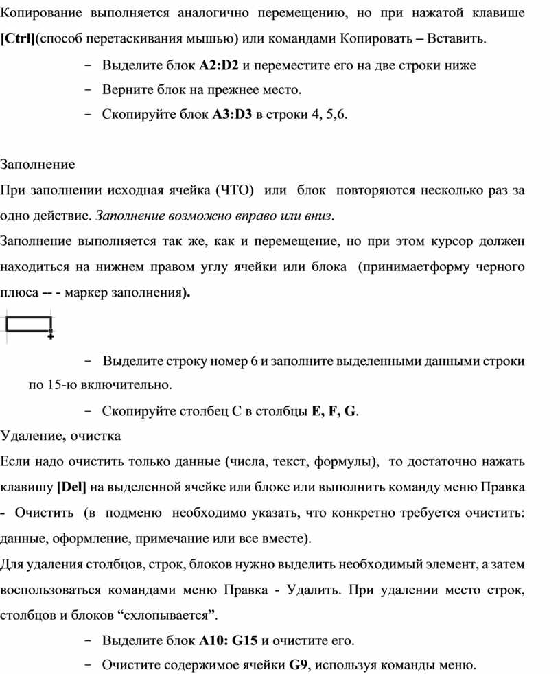 Заполнение выполняется так же, как и перемещение, но при этом курсор должен находиться на нижнем правом углу ячейки или блока (принимает форму черного плюса -- - маркер заполнения).