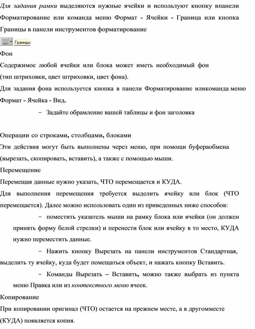 При заполнении исходная ячейка (ЧТО) или блок повторяются несколько раз за одно действие. Заполнение возможно вправо или вниз.