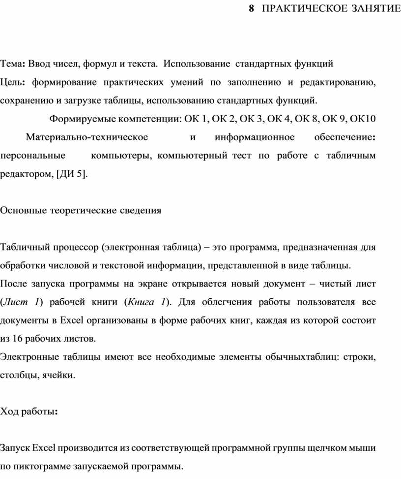 Формируемые компетенции: ОК 1, ОК 2, ОК 3, ОК 4, ОК 8, ОК 9, ОК10 Материально-техническое и информационное обеспечение: персональные компьютеры, компьютерный тест по работе с табличным