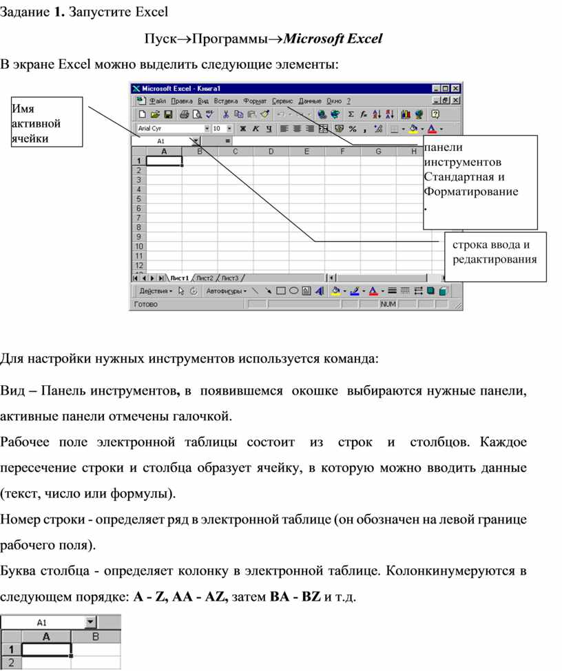 Рабочее поле электронной таблицы состоит из строк и столбцов. Каждое пересечение строки и столбца образует ячейку, в которую можно вводить данные (текст, число или формулы).