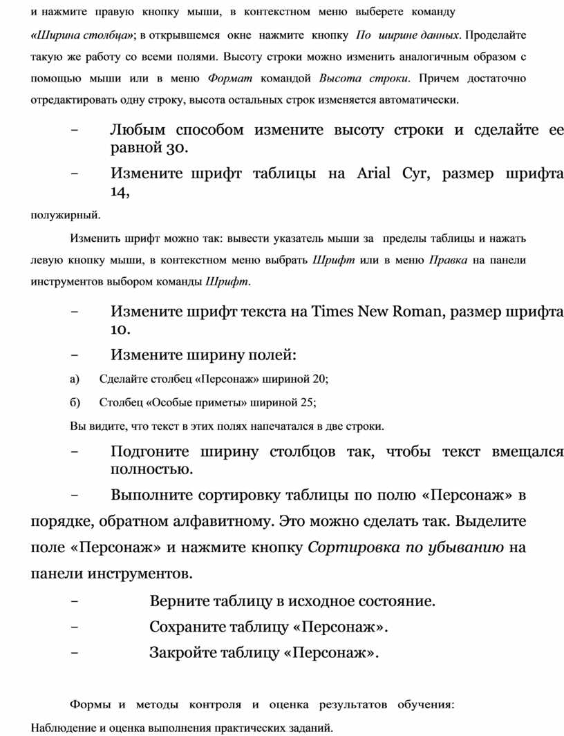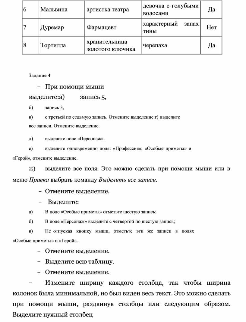 а) Сделайте столбец «Персонаж» шириной 20;