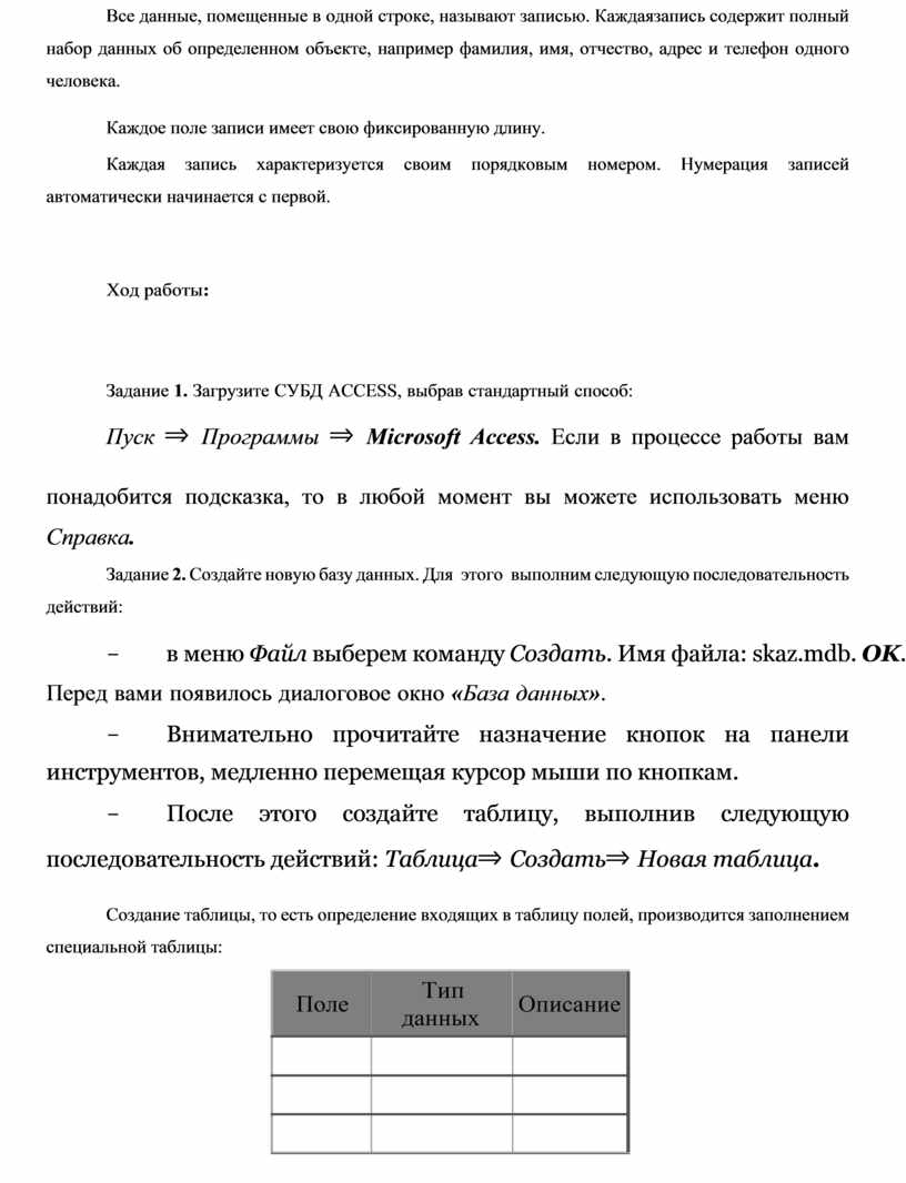 - в меню Файл выберем команду Создать. Имя файла: skaz.mdb. OK.