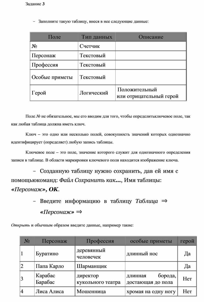 - Сохраните таблицу «Персонаж».