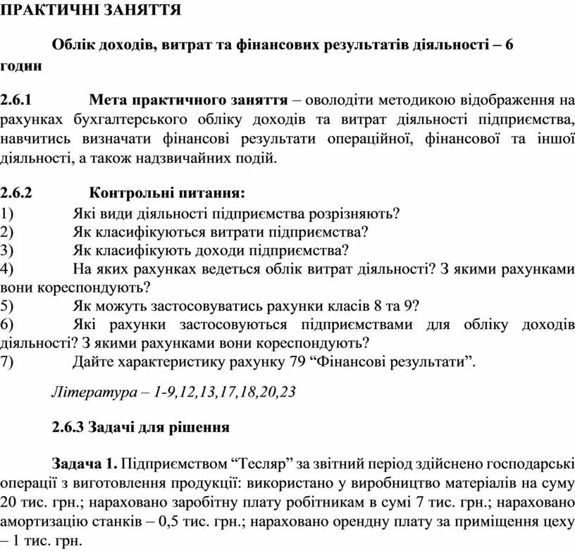 2.6.1 Мета практичного заняття – оволодіти методикою відображення на рахунках бухгалтерського обліку доходів та витрат діяльності підприємства, навчитись визначати фінансові результати операційної, фінансової та іншої діяльності, а також надзвичайних подій.