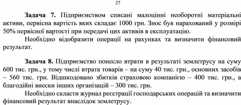 Задача 7. Підприємством списані малоцінні необоротні матеріальні активи, первісна вартість яких складає 1000 грн. Знос був нарахований у розмірі 50% первісної вартості при передачі цих активів в експлуатацію.