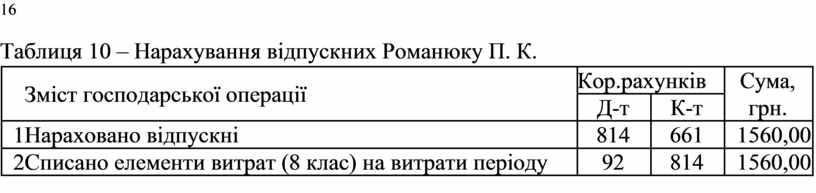 Таблиця 10 – Нарахування відпускних Романюку П. К.
