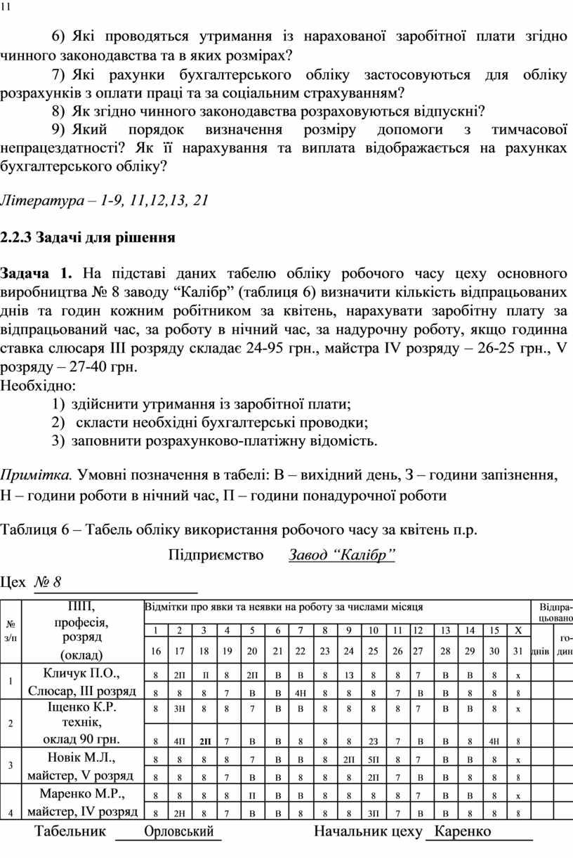 Задача 1. На підставі даних табелю обліку робочого часу цеху основного виробництва № 8 заводу “Калібр” (таблиця 6) визначити кількість відпрацьованих днів та годин кожним робітником за квітень, нарахувати заробітну плату за відпрацьований час, за роботу в нічний час, за надурочну роботу, якщо годинна ставка слюсаря ІІІ розряду складає 24-95 грн., майстра ІV розряду – 26-25 грн., V розряду – 27-40 грн.