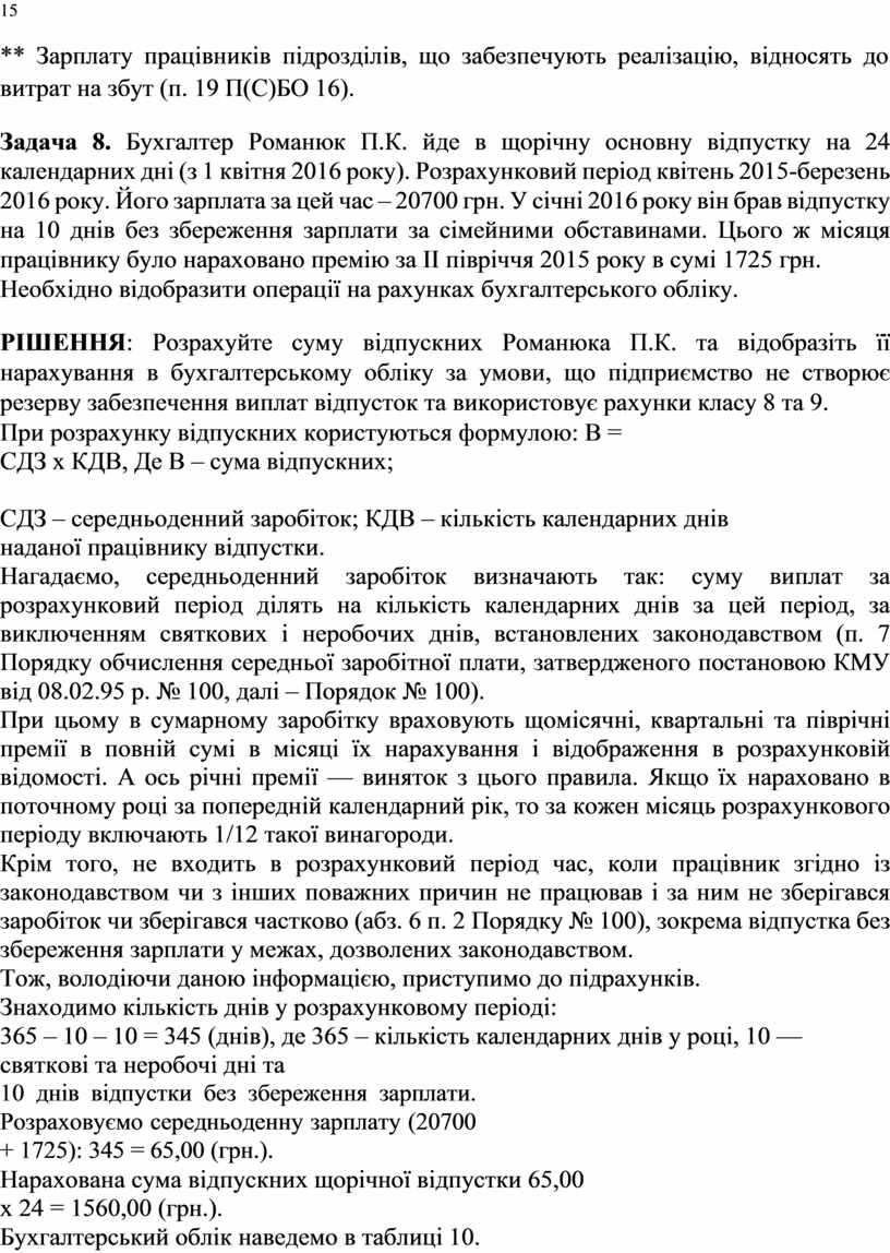 Задача 8. Бухгалтер Романюк П.К. йде в щорічну основну відпустку на 24 календарних дні (з 1 квітня 2016 року). Розрахунковий період квітень 2015-березень 2016 року. Його зарплата за цей час – 20700 грн. У січні 2016 року він брав відпустку на 10 днів без збереження зарплати за сімейними обставинами. Цього ж місяця працівнику було нараховано премію за ІІ півріччя 2015 року в сумі 1725 грн.