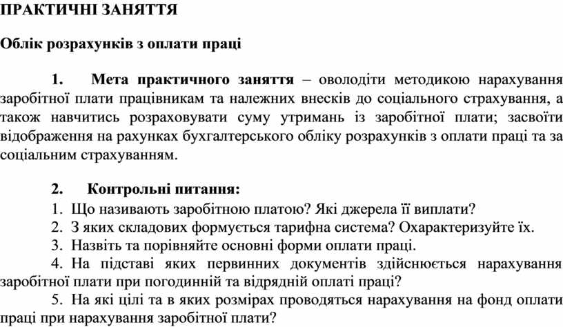 1. Мета практичного заняття – оволодіти методикою нарахування заробітної плати працівникам та належних внесків до соціального страхування, а також навчитись розраховувати суму утримань із заробітної плати; засвоїти відображення на рахунках бухгалтерського обліку розрахунків з оплати праці та за соціальним страхуванням.