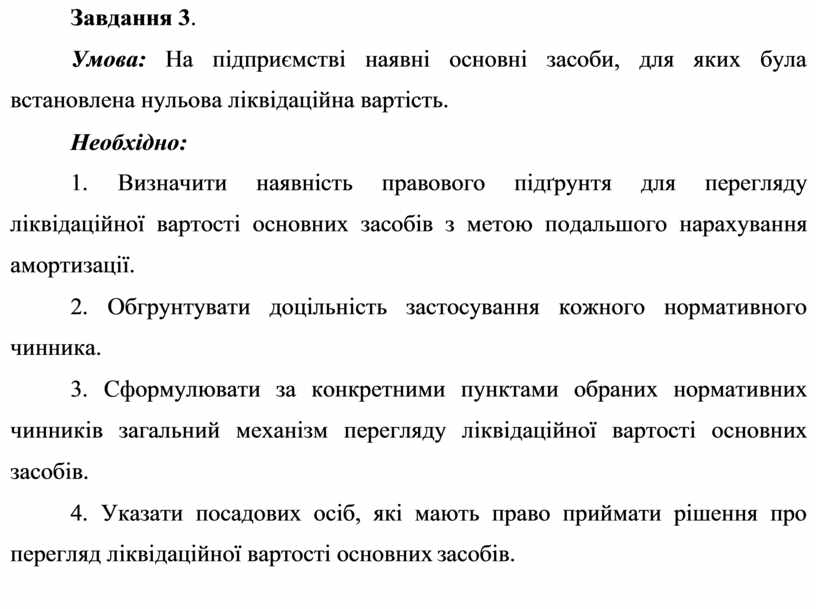 1. Визначити наявність правового підґрунтя для перегляду ліквідаційної вартості основних засобів з метою подальшого нарахування амортизації.
