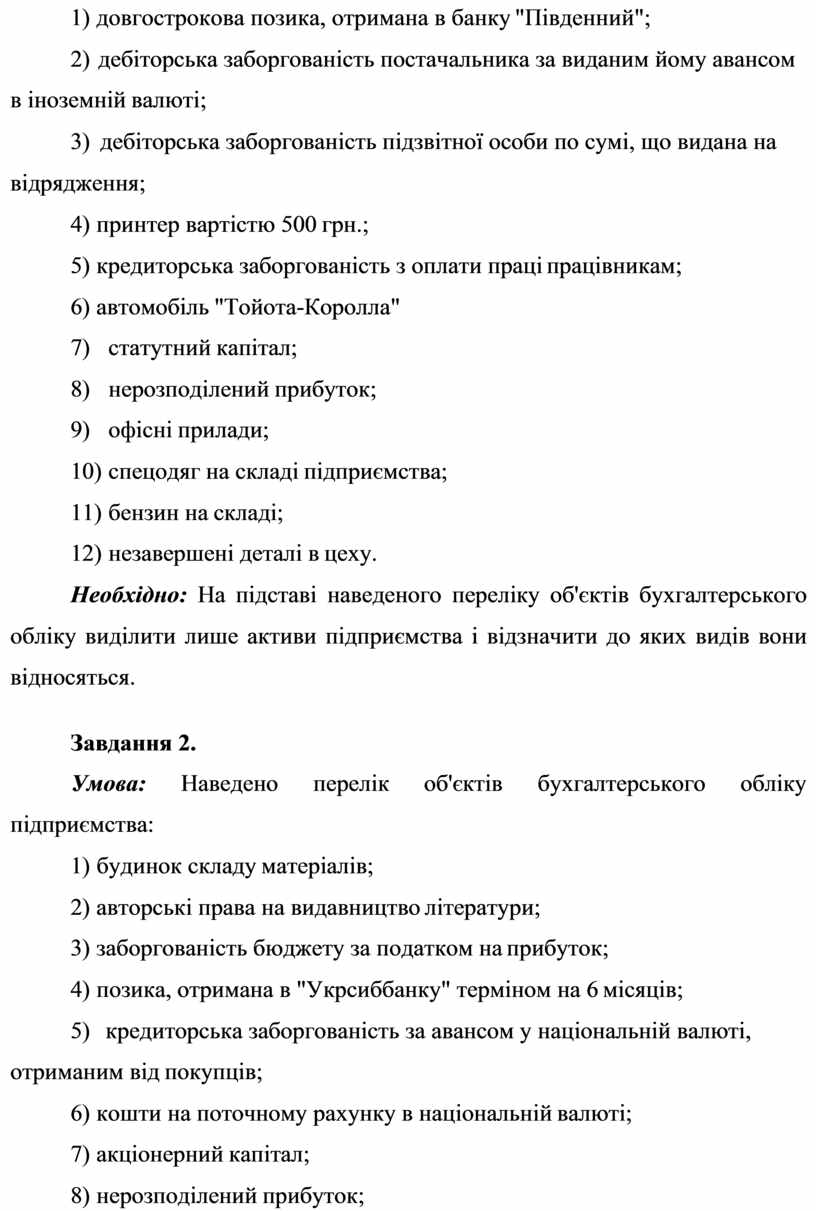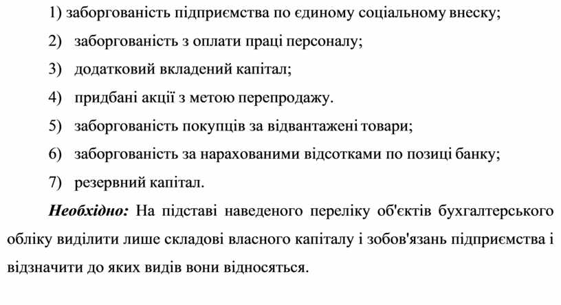 Необхідно: На підставі наведеного переліку об'єктів бухгалтерського обліку виділити лише складові власного капіталу і зобов'язань підприємства і відзначити до яких видів вони відносяться.