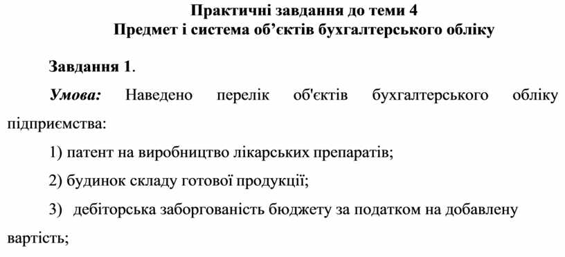 Умова: Наведено перелік об'єктів бухгалтерського обліку підприємства: