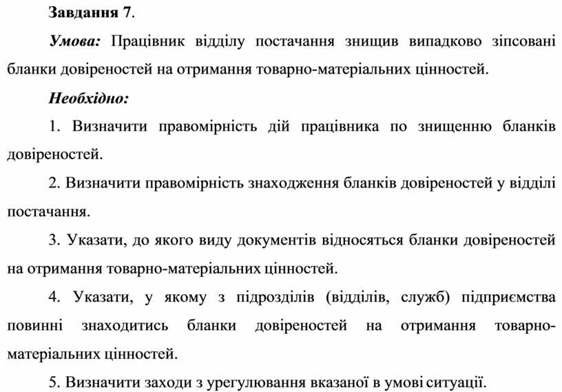 Умова: Працівник відділу постачання знищив випадково зіпсовані бланки довіреностей на отримання товарно-матеріальних цінностей.
